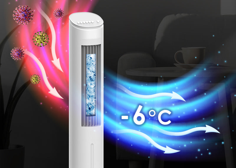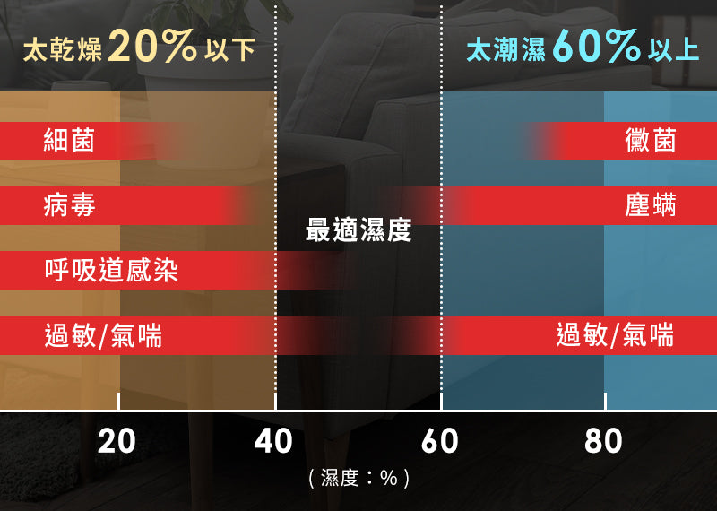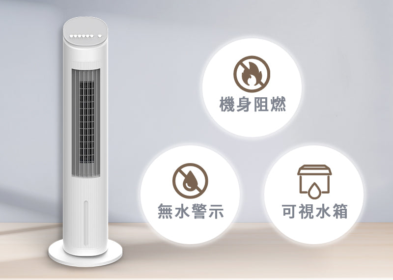 當空氣中的濕度過低時,容易影響呼吸道系統,並延長病毒的存活時間。我們的智能濕度偵測功能能將室內濕度維持在最適合人體的50%-60%,並在達到此濕度後停止加濕,持續吹出冷風,呵護您的健康。