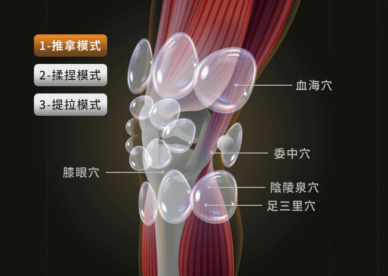 3檔按摩模式,腿膝360°全方位循環按摩。並搭配膝蓋環狀排列氣囊及後側按壓,有效放鬆增加血液循環,促進滑液生成。