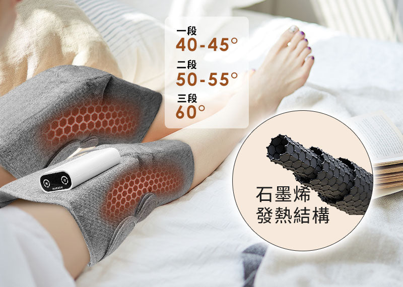 石墨烯材質3秒瞬熱技術,三檔溫度控制:40-45°、50-55°、60°。促進膝蓋血液循環,有助肌肉延展提升膝蓋活動度及柔軟度。季節性膝蓋不適、生理期,也可以舒服溫熱到睡著!