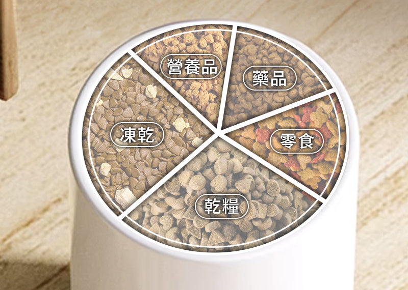 內建五格設計從一般乾糧、零食到保健食品一次收納,照顧寵物飲食均衡。