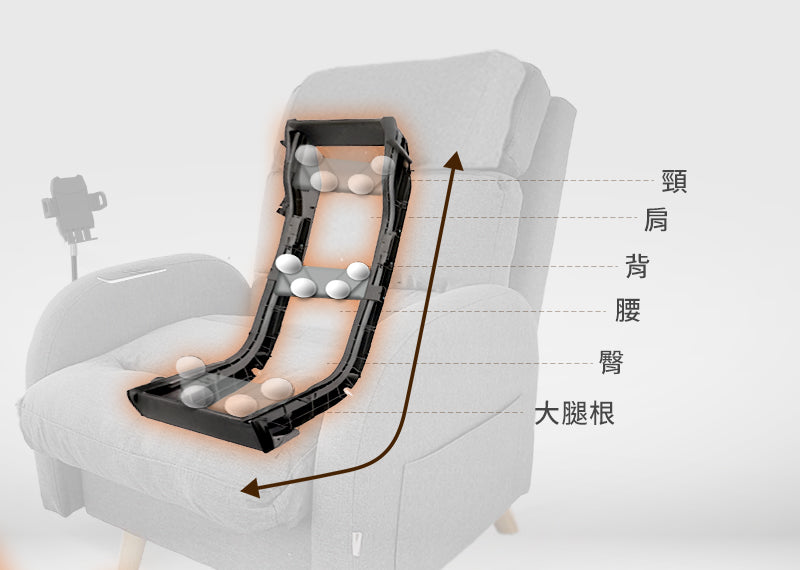 透過導軌上下移動、擺動,創造出多變的按摩體驗,就如同請了位專業按摩師父到家,舒緩你的疲勞。
