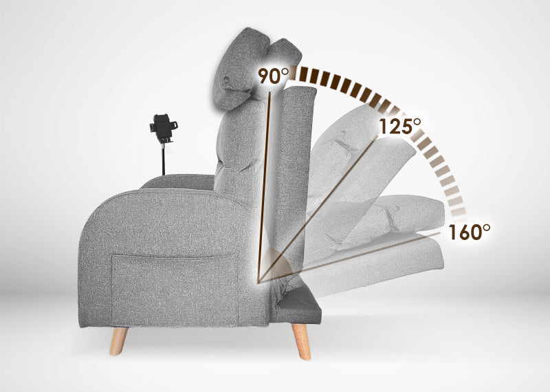 90°-125°-160°可依不同需求調整椅背角度,輕鬆轉換沙發、斜靠式和躺式按摩椅,自由調整到更舒適的角度。