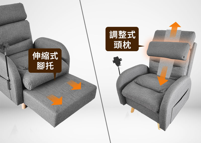 腳托可自由伸縮,實現躺平體驗;平時無使用時可將頭枕反放下移至腰部,當作腰靠擋住按摩頭的異物感,搖身一變為超舒適的懶人沙發。